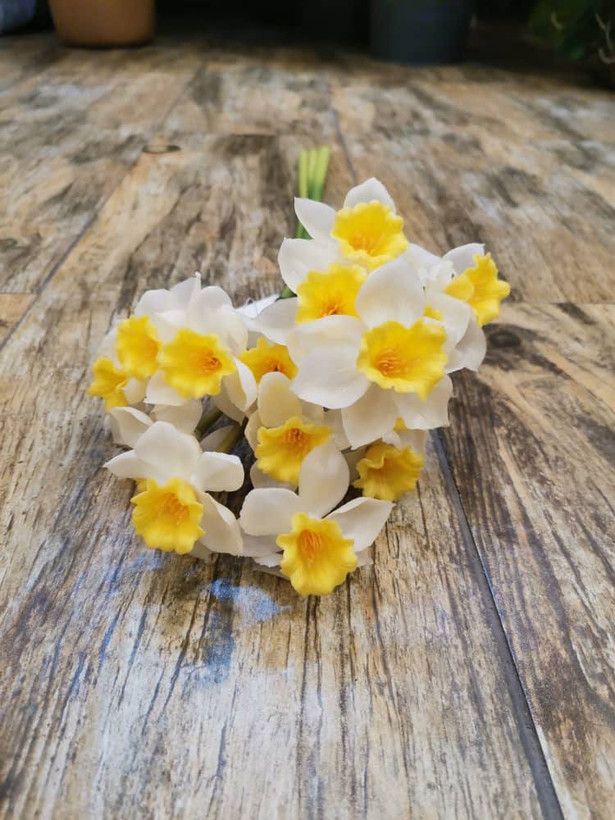 دستهای از نرگسهای سفید–طلایی که با جزئیات ظریف و متریال درجهیک طراحی شدهاند تا حس لطافت گل طبیعی را در هر فضا زنده کنند.